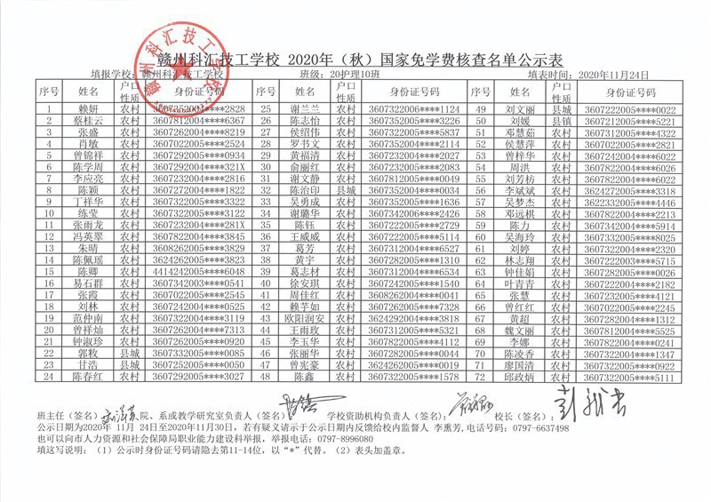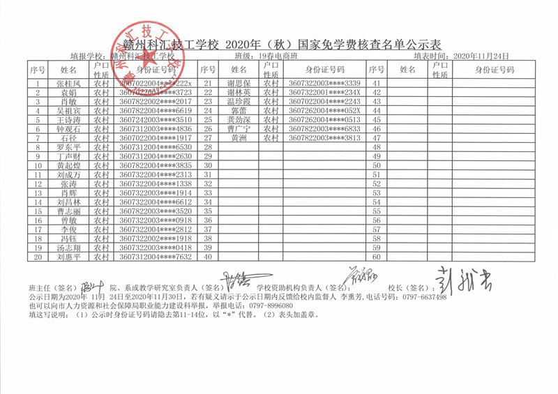 赣州科汇技工学校2020年秋季国家免学费核查名单